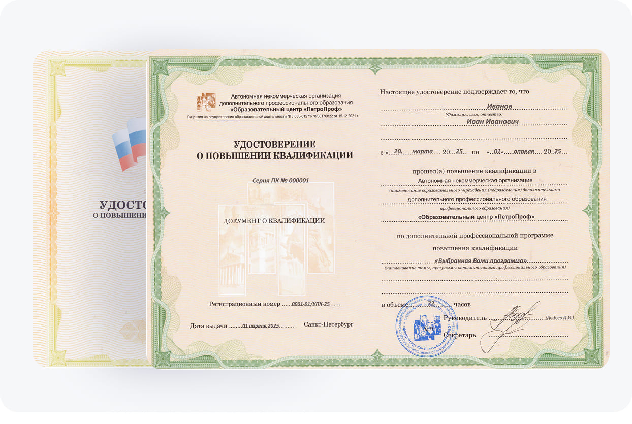 По завершении программы обучения каждый слушатель получает официальное удостоверение о повышении квалификации (УПК). Наш учебный центр «ПетроПроф» обладает всеми необходимыми лицензиями и аккредитациями, а значит, мы гарантируем высокое качество предоставляемых образовательных услуг и юридическую значимость выдаваемых документов об образовании.